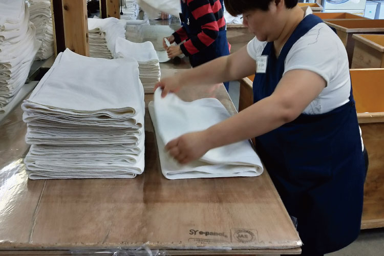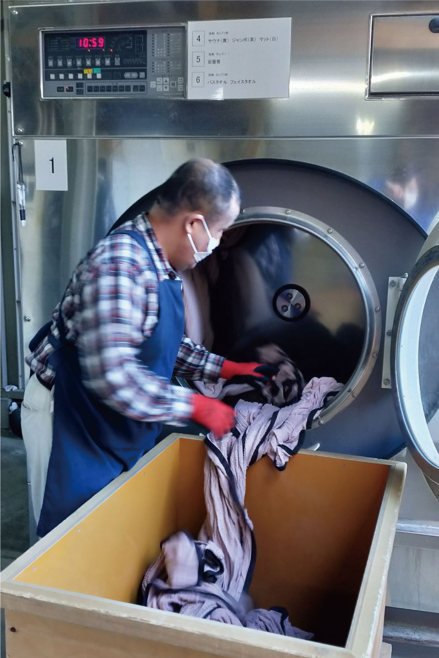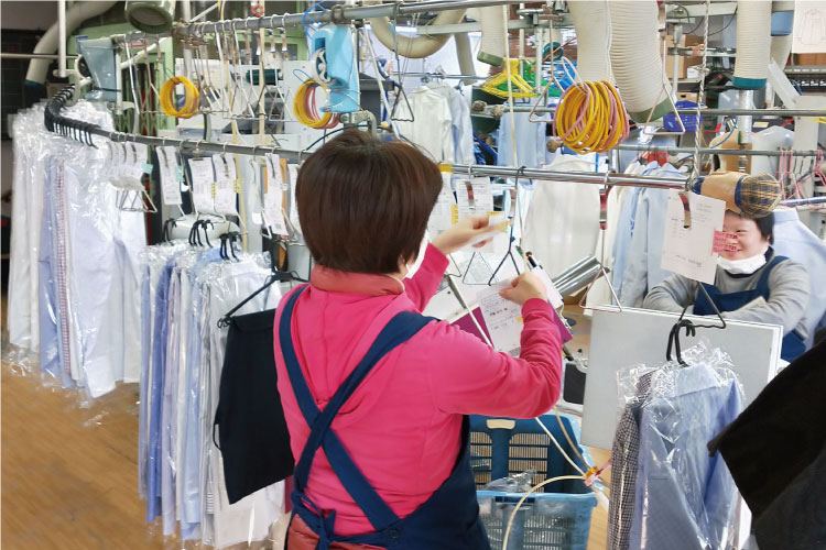 アッセンブリ(ドライ) 仕上がってきた品物を部店ごとに番号分けします アッセンブリ(ワイシャツ) 仕上がってきた品物を部店ごとに番号分けします リネン(洗い・乾燥) 温浴施設やフィットネスクラブなどのタオル類を洗って乾燥させます リネン(タタミ) 乾燥機から出てきた品物をタタミます